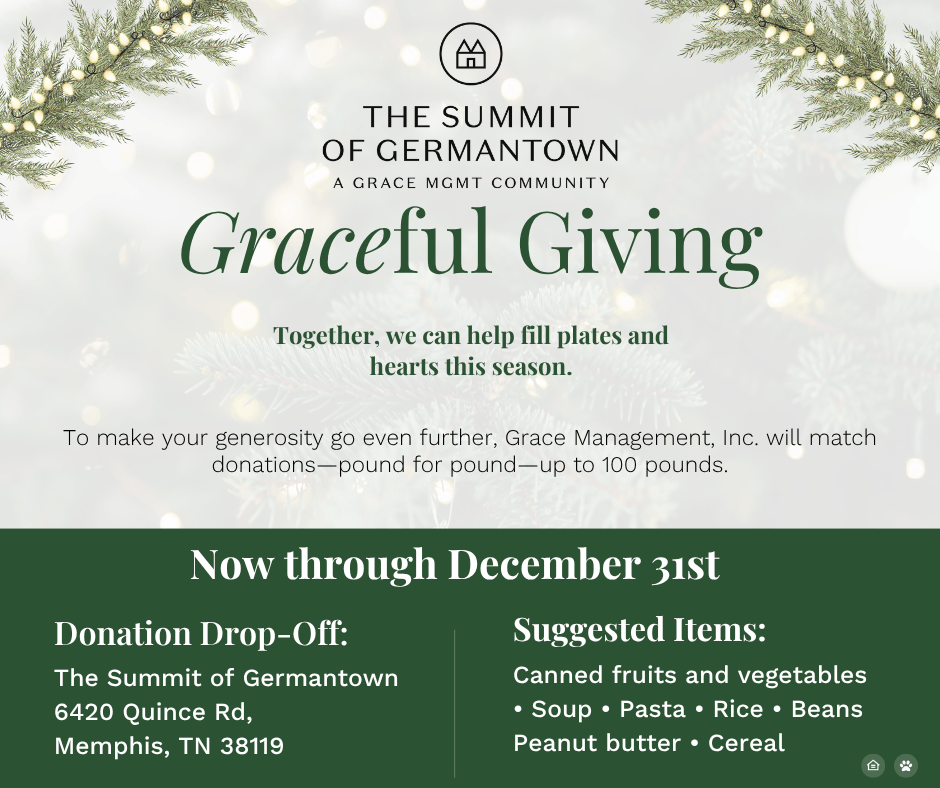 To make your generosity go even further, Grace Management, Inc. will match donations—pound for pound—up to 100 lbs! We can help fill plates and hearts this season through Graceful Giving.
